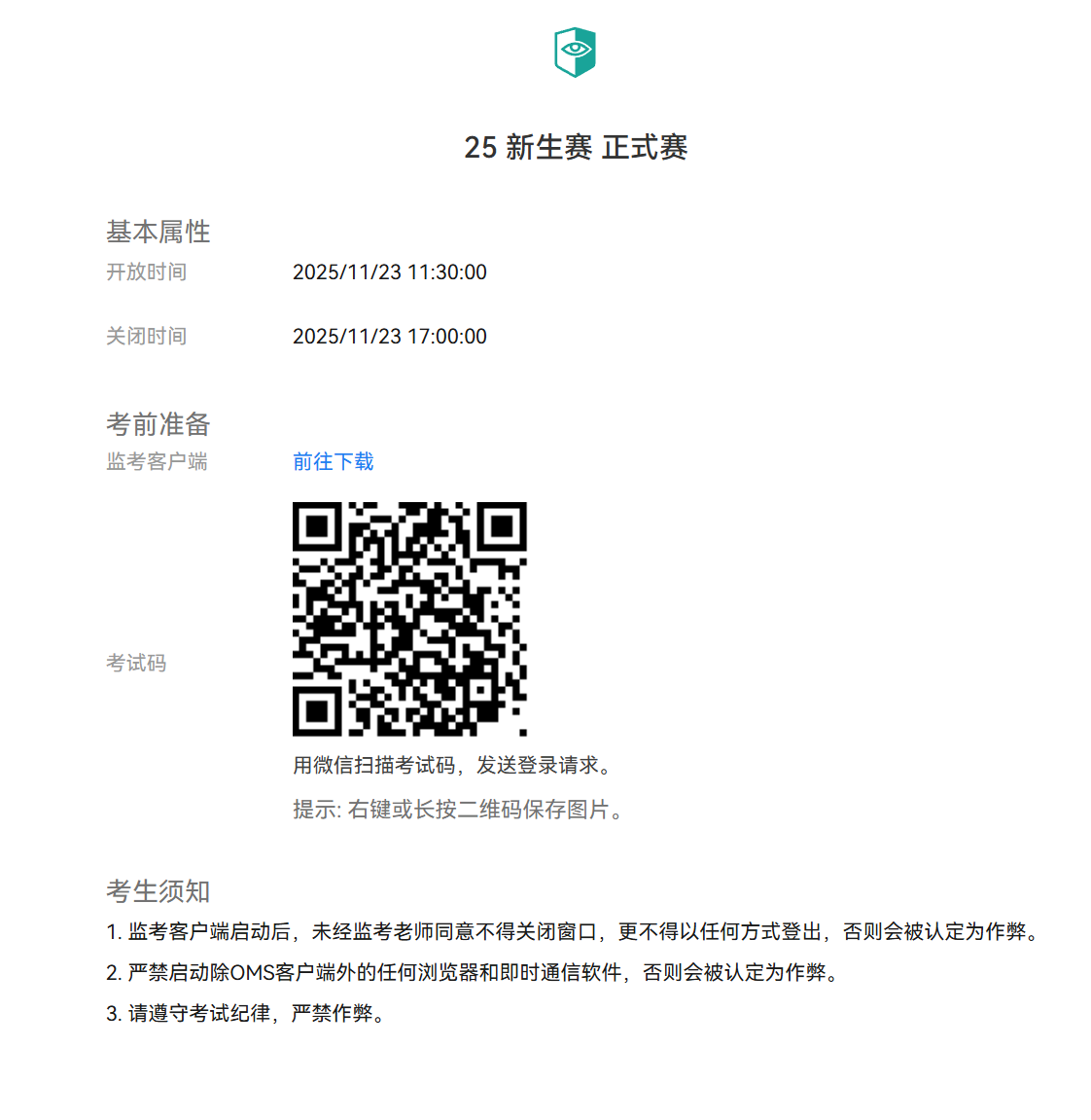 3、 本次比赛按照惯例使用OMS系统实行线上+线下监考和反作弊,须自行准备考试需要的机器和环境。请提前安装OMS系统,请按照《OMS用户自测流程》完成本地考试条件测试,可参考教学视频《如何搞定OMS监考系统》 以及补充视频《OMS踩坑排雷攻略》。