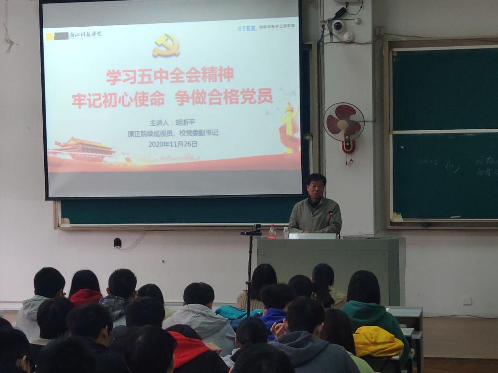 本次活动邀请到了浙江科技学院关工委常务副主任,原党委副书记胡浙平老师为我们深入讲解十九届五中全会精神,胡书记首先向我们描述了我国现阶段取得的一系列成果,其中包括粮食产量连续五年破万亿以上,5575万农村贫困人口脱贫等等,同时还深入分析了我国目前面临的国际局势,以及在新冠疫情下我国所展现的强大力量。最后,胡书记还从四个方面分析青年大学生如何争取入党,做合格党员,坚定了同学们爱党爱国的理想信念。
