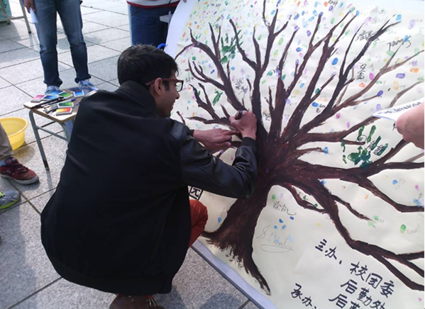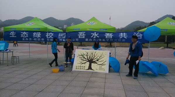 2014年4月2日,由校团委、后勤处、后勤服务公司主办,信息学院分团委承办的“生态绿校园,吾水吾共治”活动之“指纹签名 绿色承诺”活动终于在科院师生的热切期待中于圆形广场隆重举行。贴合活动主题的蓝色系现场布置及新颖的指纹签名形式引起了大批师生的驻足和参与,活动现场的气氛十分热烈。大家积极地在环保树上按下了指纹和手印,并在指纹上签上自己的姓名,以表达对积极投身创建绿色校园,珍惜身边水资源的承诺。更令人欣慰的是,许多参与同学在参与活动时纷纷将手中的宣传单归还至工作人员手中,希望传单可以得到循环利用,表达“环保绿色就从身边小事做起”的决心。活动还为每一位参与师生准备了一份由信息学院独立设计、带有信息微信平台(科院那抹蓝)吉祥物形象的节水标语不干胶作为纪念,让节水·惜水的绿色环保理念在师生中得到更广泛而持久的传播。