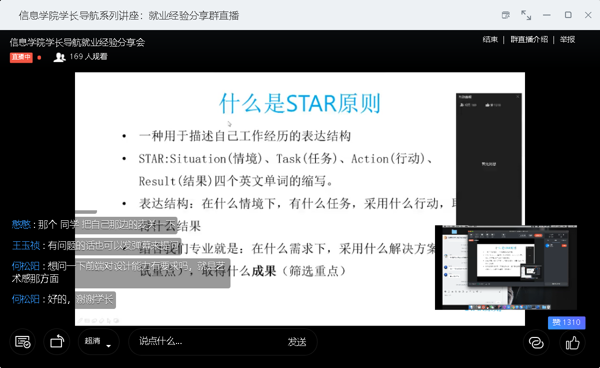 于5月23日下午14点30分举办了线上就业经验分享会。信息学院18级辅导员谢超凡老师,以及各年级同学180余人参加了本次讲座。