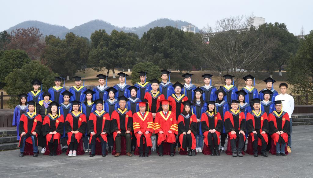 校长赵东福向2022届全体毕业生致以祝贺,并为每一位毕业生拨正硕士帽上的流苏、授予学位证书,颁发纪念章并合影留念。副校长万健宣读学位授予文件,并作为导师代表与毕业生们一一握手庆祝。
