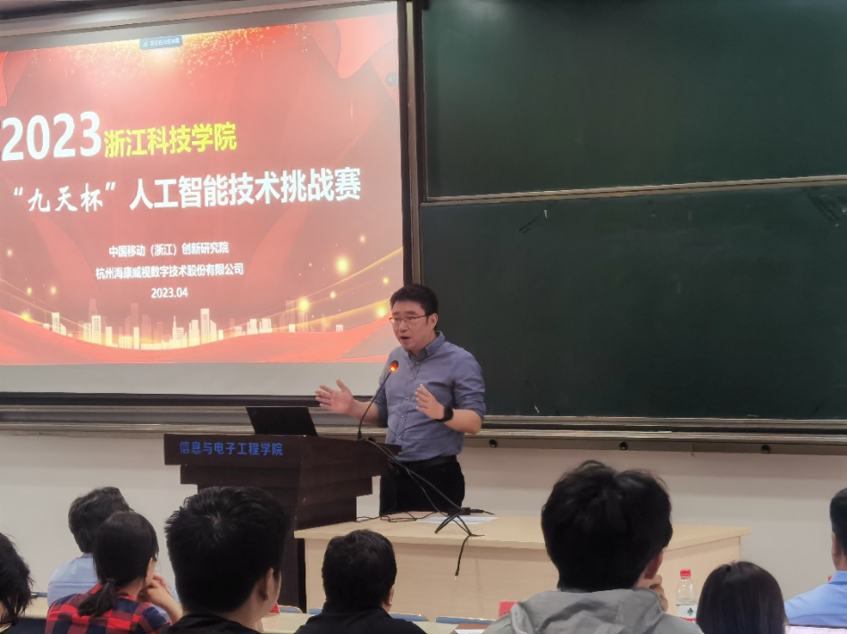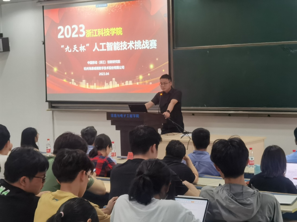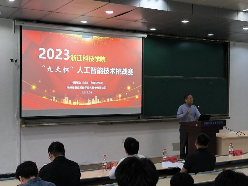 2023年4月18日,赛事启动仪式暨赛题发布会召开,信息学院、电气学院、理学院等相关专业教师与学生近200人参会,安吉校区部分学生通过视频会议方式参加。教务处副处长刘洪民代表学校对竞赛的举办表示欢迎,感谢合作企业的大力支持,并介绍了学校对学科竞赛的政策支持以及近年来所取得的成绩。信息与电子工程学院书记张蕾肯定了企业命题对锻炼学生应用创新能力的重要作用,希望今后能够进一步深化多种形式的校企合作,鼓励学生积极参加竞赛,预祝取得好的成绩。中国移动(浙江)创新研究院副院长蒋健重点介绍了本届“九天杯”人工智能技术挑战赛的相关信息,并分享了中国移动九天・毕昇平台为高校师生所提供的人工智能领域的课程学习、竞赛、科研、求职、教学等一站式云端服务。海康威视杭州分公司郭兴锋总监介绍了公司二十年来的发展历程与在新时代背景下公司的转型,并邀请学生未来能够加入海康威视。