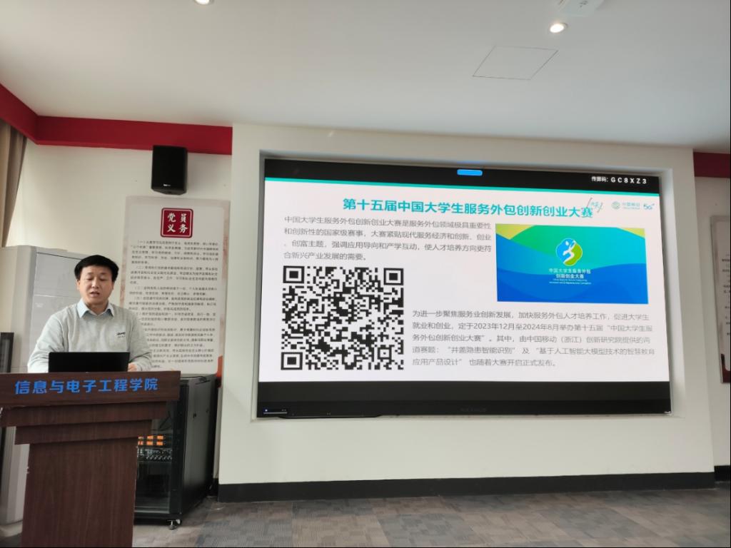宣讲会伊始,信息学院副院长魏英老师首先欢迎了来自中国移动(浙江)创新研究院和海康威视数字技术股份有限公司的专家,介绍了服务外包创新创业大赛的基本信息,并强调了竞赛参与在学生个人发展中的重要性。